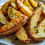 Crispy potato wedges coated in garlic and Parmesan, perfect for snacking or as a side dish.
