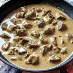 A comforting dish of tender beef in a creamy mushroom sauce served over egg noodles, perfect for busy weeknights.