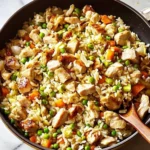 A comforting and flavorful dish featuring tender chicken, colorful vegetables, and glistening grains of fried rice.