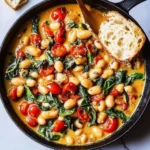 A comforting skillet dish with creamy white beans, garlic, fresh tomatoes, and spinach that is quick to prepare and perfect for cozy family dinners.
