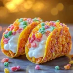 Fruity Pebbles Cheesecake Tacos are a delightful and whimsical dessert that combines the sweet, fruity flavors of everyone’s favorite cereal with a rich and creamy cheesecake filling.