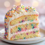 A joyful dessert featuring layers of fluffy funfetti cake interspersed with creamy cheesecake and vibrant sprinkles.