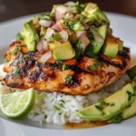 - Now, it’s time to assemble! On each plate, layer a generous scoop of cooked rice. Place the sliced grilled chicken on top, and then heap the creamy avocado mixture alongside. For an added touch of color and flavor, garnish with lime wedges and a sprinkle of fresh cilantro if desired.