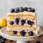 A delightful dessert featuring layers of moist cake infused with zesty lemon and bursting with fresh blueberries, topped with creamy frosting.