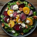A colorful and nutritious salad featuring roasted beets, mixed greens, walnuts, and goat cheese, perfect for winter meals.